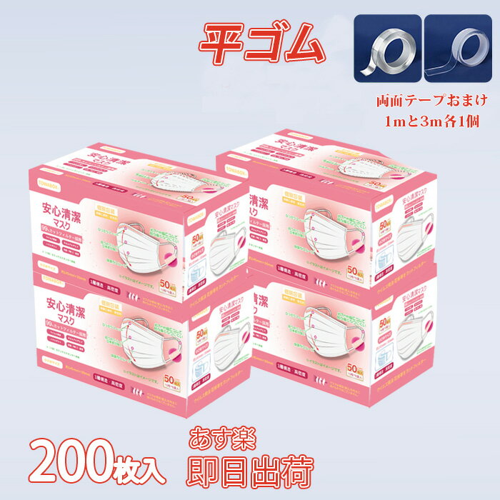 【両面テープ1mと3m各1個おまけ】 マスク 1枚づつ 個包装 不織布 平ゴム 在庫あり 箱 200枚 使い捨てマスク 耳が痛くならない 個別包装 使い捨て 小顔 男女兼用 大人用 3層構造 日常用 飛沫対策 花粉対策 PL保険加入済み 小さめ 小さめサイズ 女性用 ピンク TOWA 東和